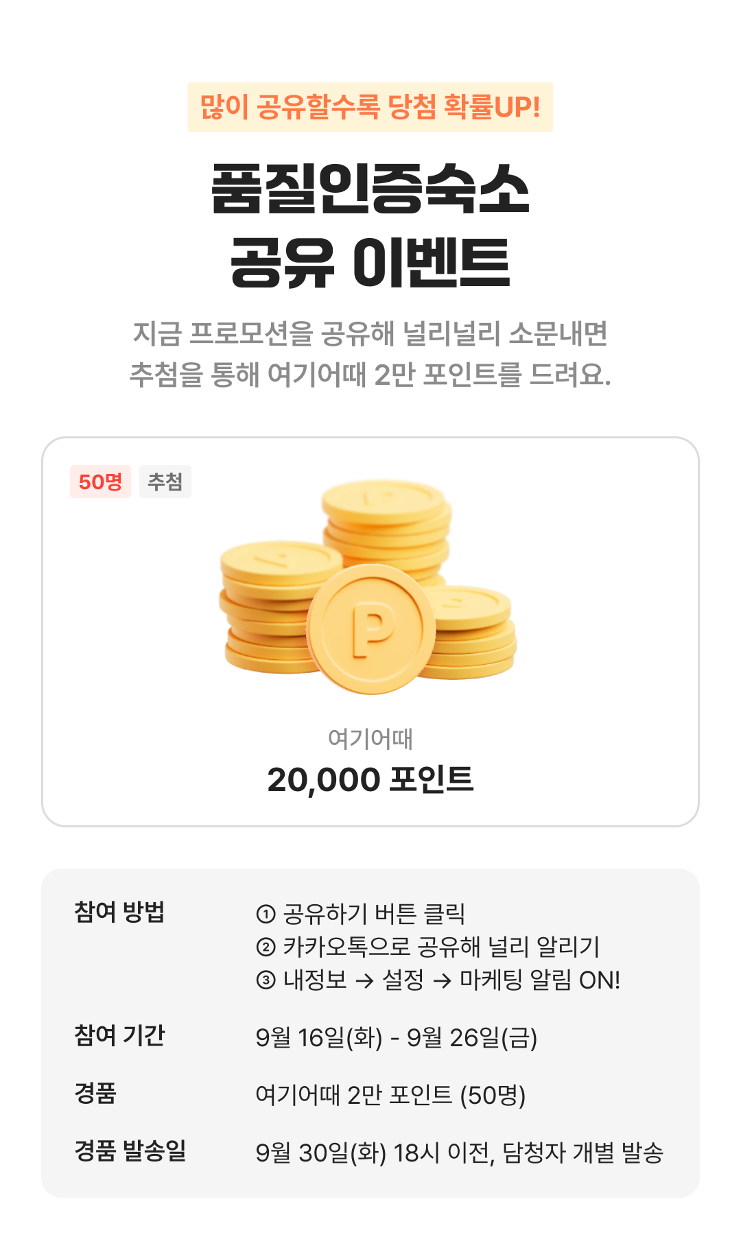 - 9/30(화) 당첨되신 고객 계정으로 여기어때 2만 포인트 지급되며, 당첨 고객에게는 개별 당첨안내 문자 발송됩니다.