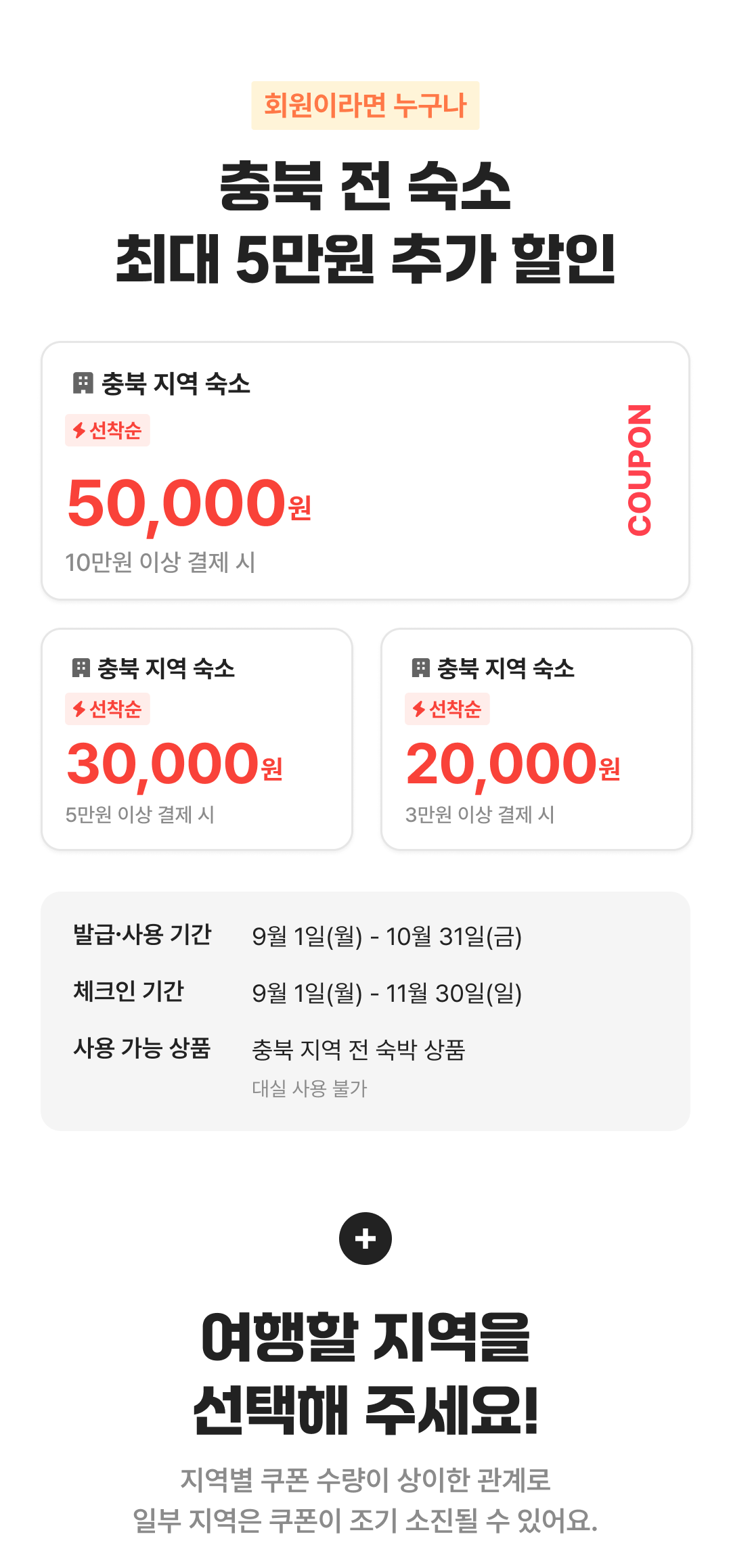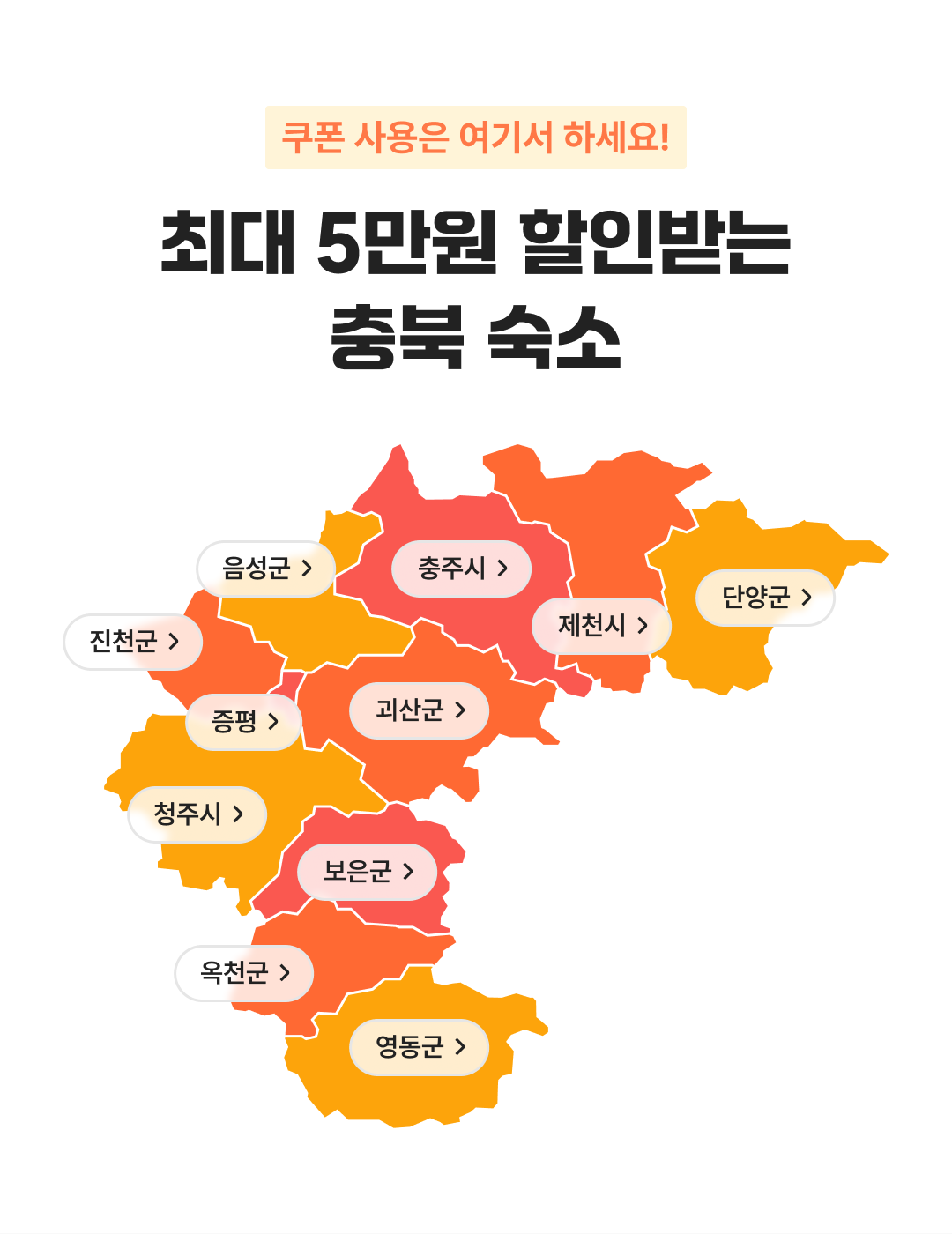 본 쿠폰은 선택한 충북 지역 내 전 숙소에서 사용 가능합니다.