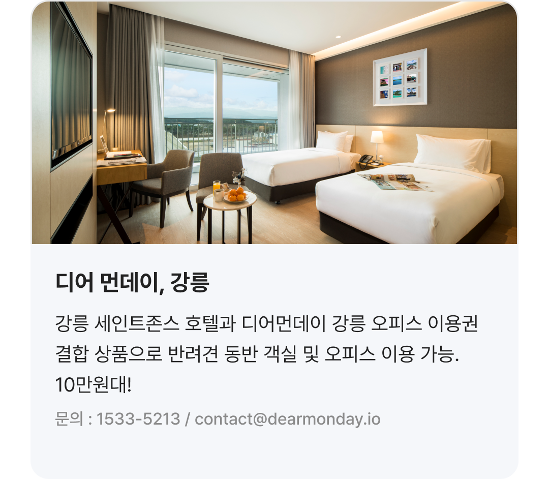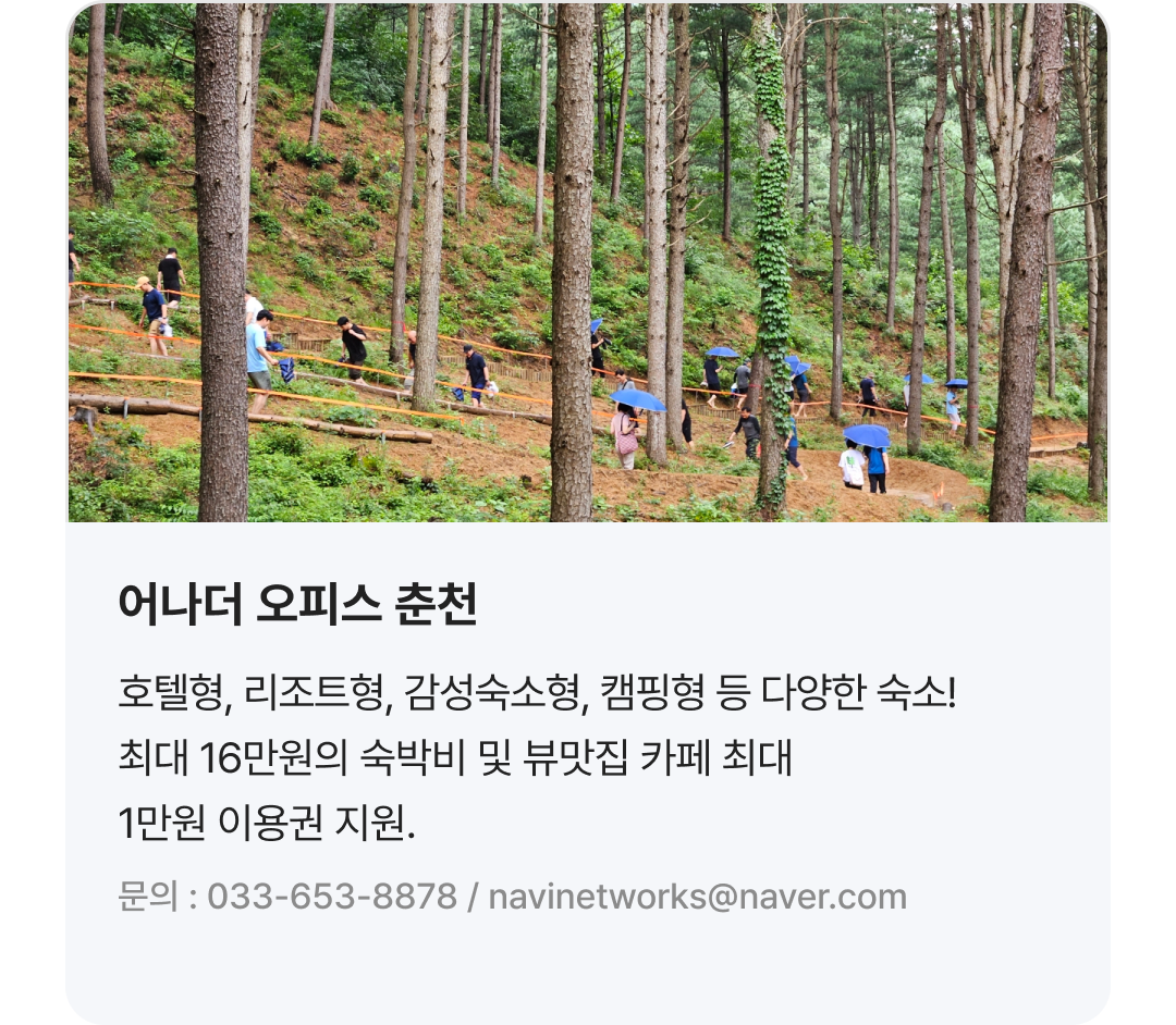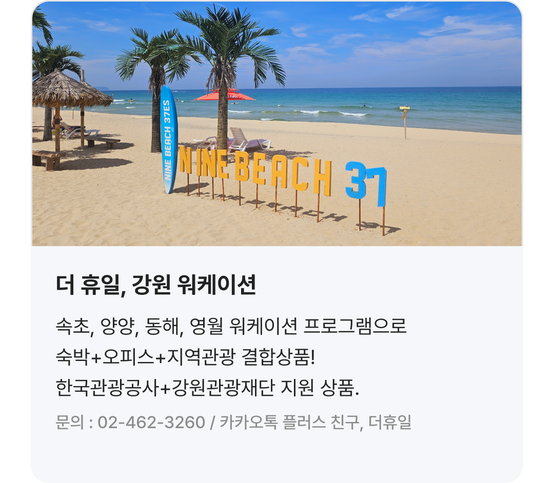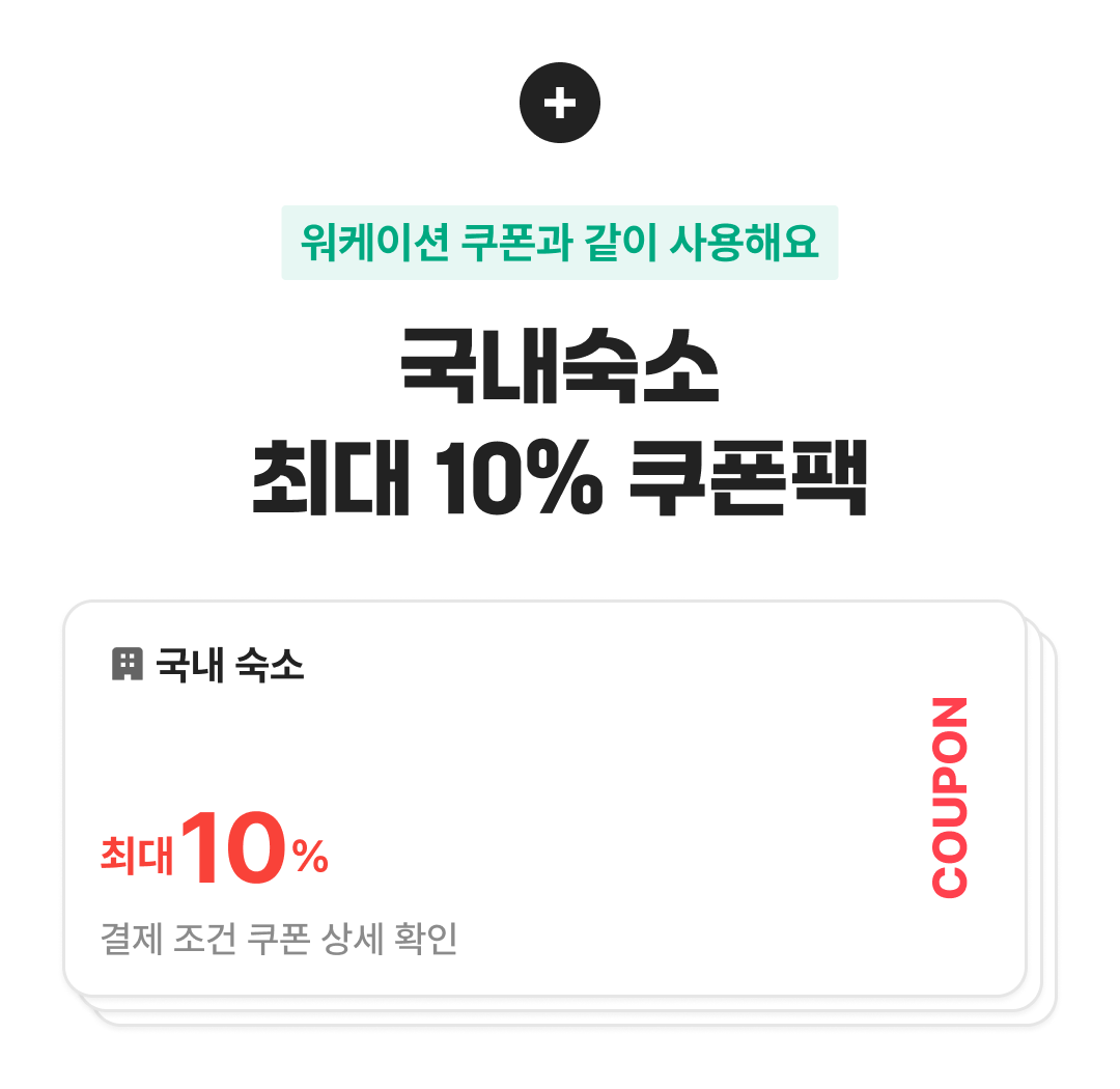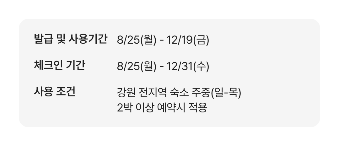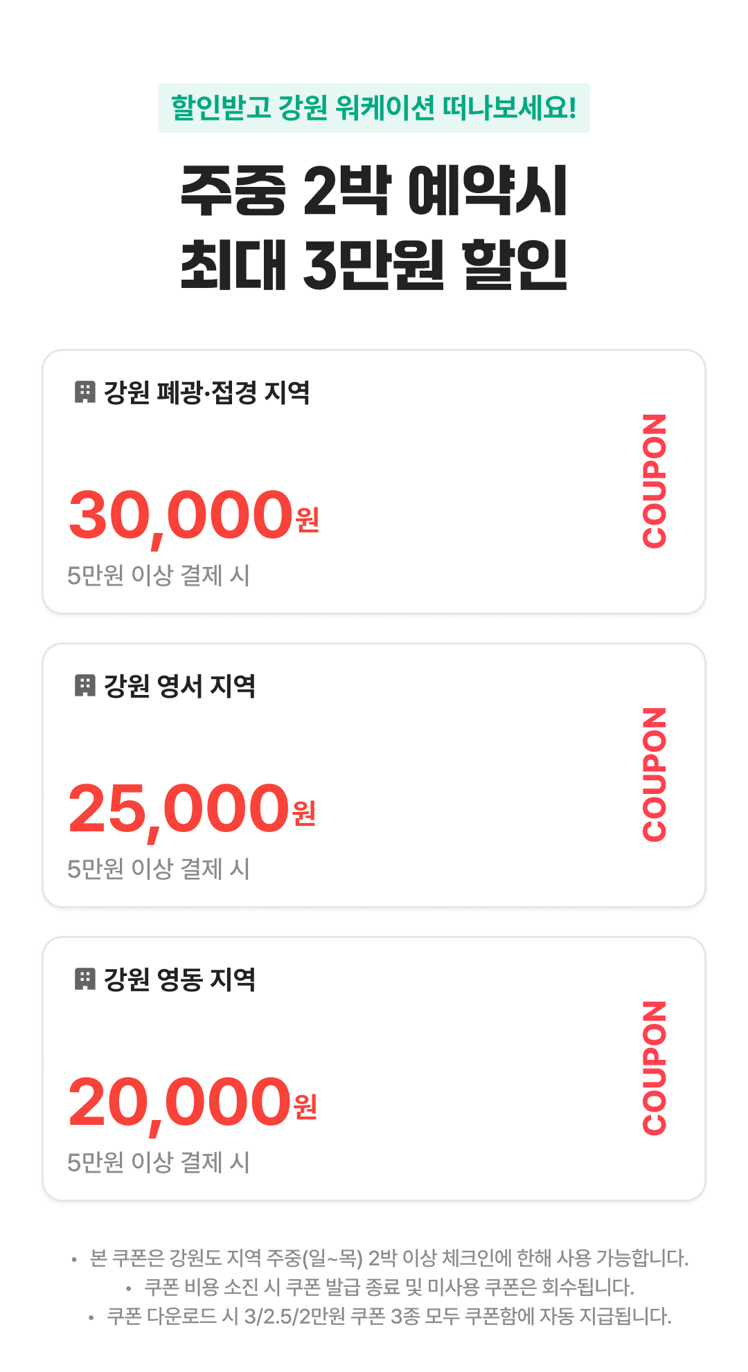 - 본 쿠폰은 강원도 지역 주중(일~목) 2박 이상 체크인에 한해 사용 가능합니다.